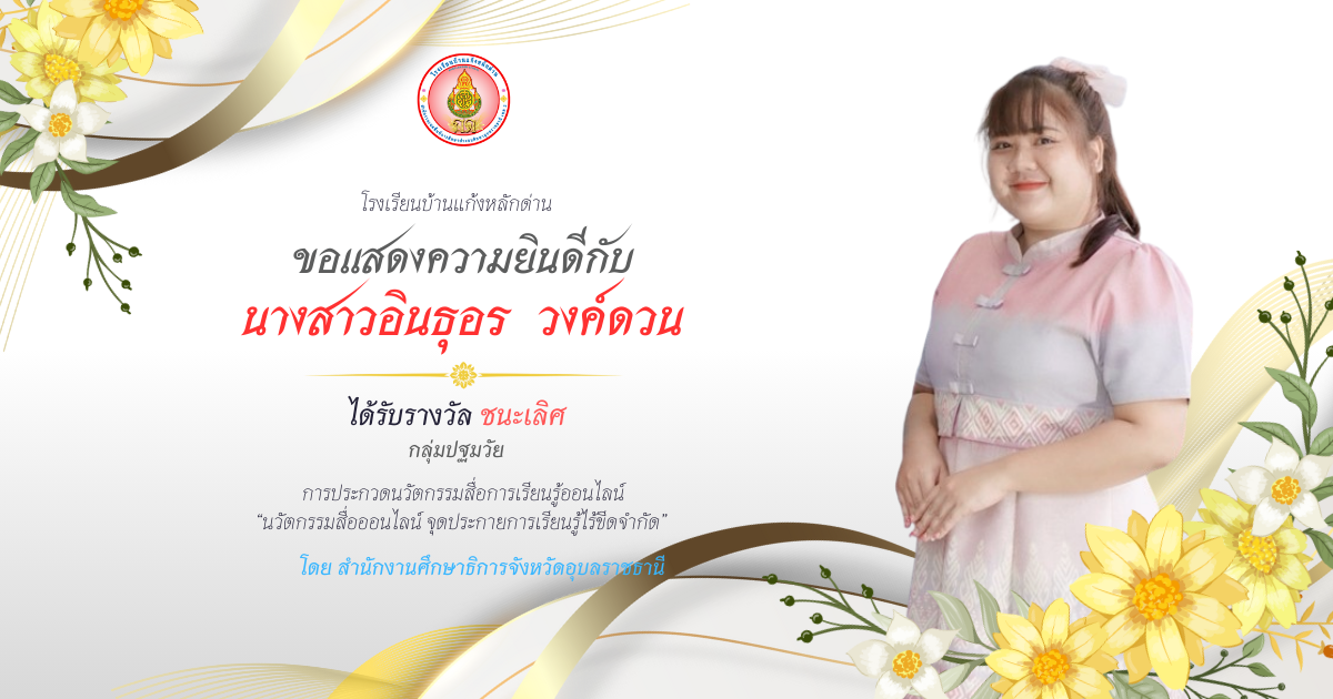 ขอแสดงความยินดีกับ นางสาวอินธุอร วงค์ดวน ได้รับรางวัลชนะเลิศ กลุ่มปฐมวัย การประกวดนวัตกรรมสื่อการเรียนรู้ออนไลน์ หัวข้อ