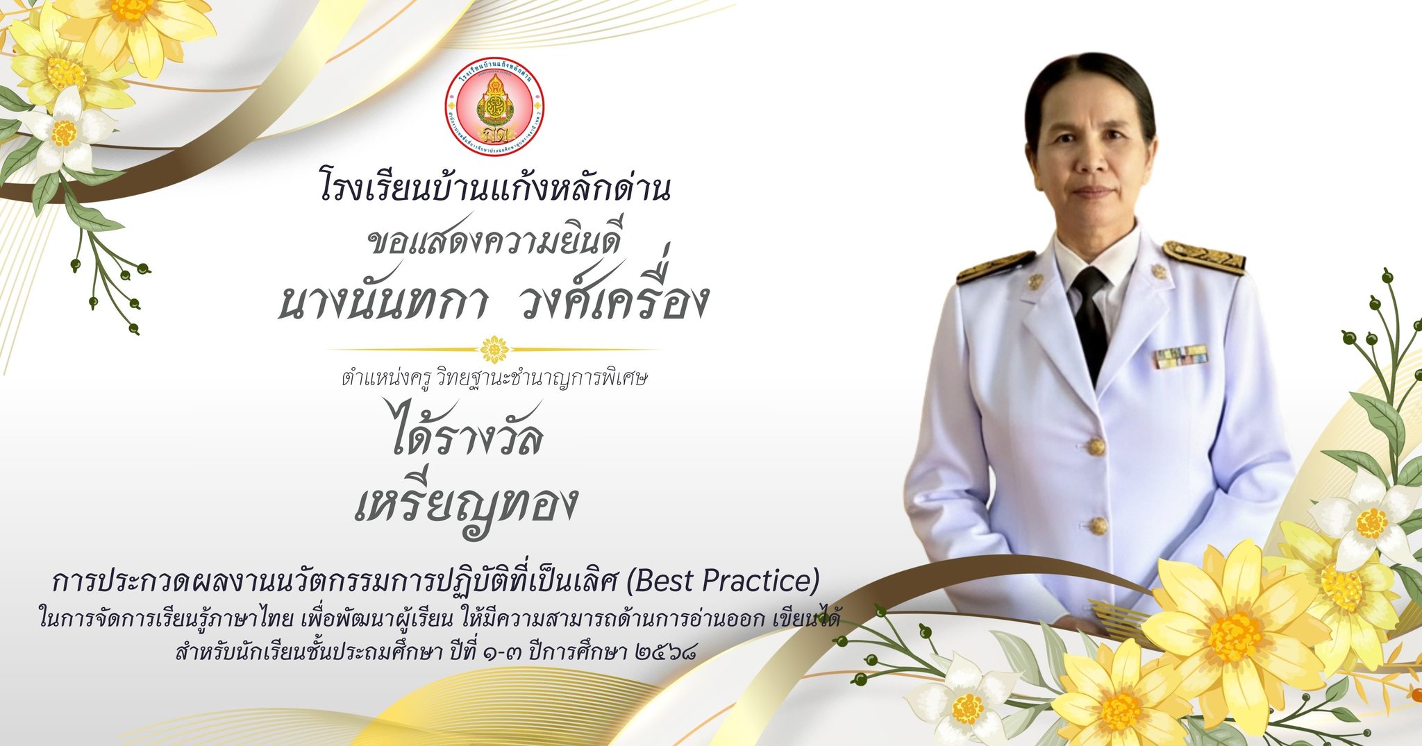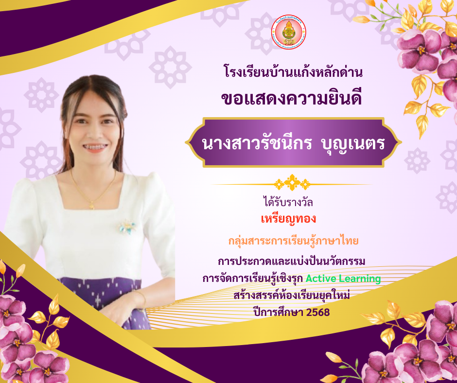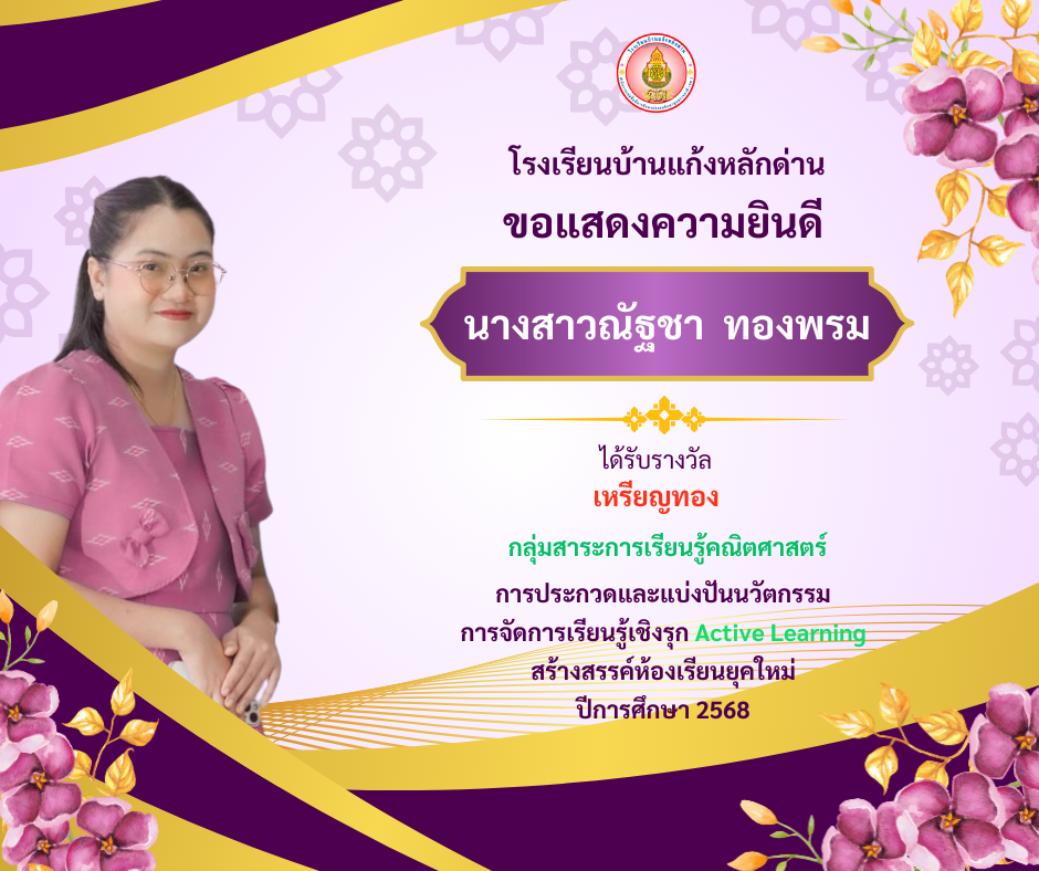 ขอแสดงความยินดีกับคุณครูรัชนีกร บุญเนตร คุณครูณัฐชา ทองพรม ได้รับรางวัลเหรียญทอง การประกวดและแย่งปันนวัตกรรมการจัดการเรียนรู้เชิงรุก Active Learning